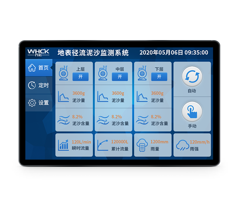为了满足教育研究机构和科学研究机构对实时降雨的需求,PA集团测控自主研发了地表径流泥沙监测系统,该系统用于径流站,为各种实验提供监测条件。相应配套触摸屏软件可以实时显示当前瞬时流速和瞬时流量,并且通过触摸屏配套软件可以实时控制整个监测的过程,可以通过查询方式查询历史数据,并能导出数据到Excel格式文件等功能。